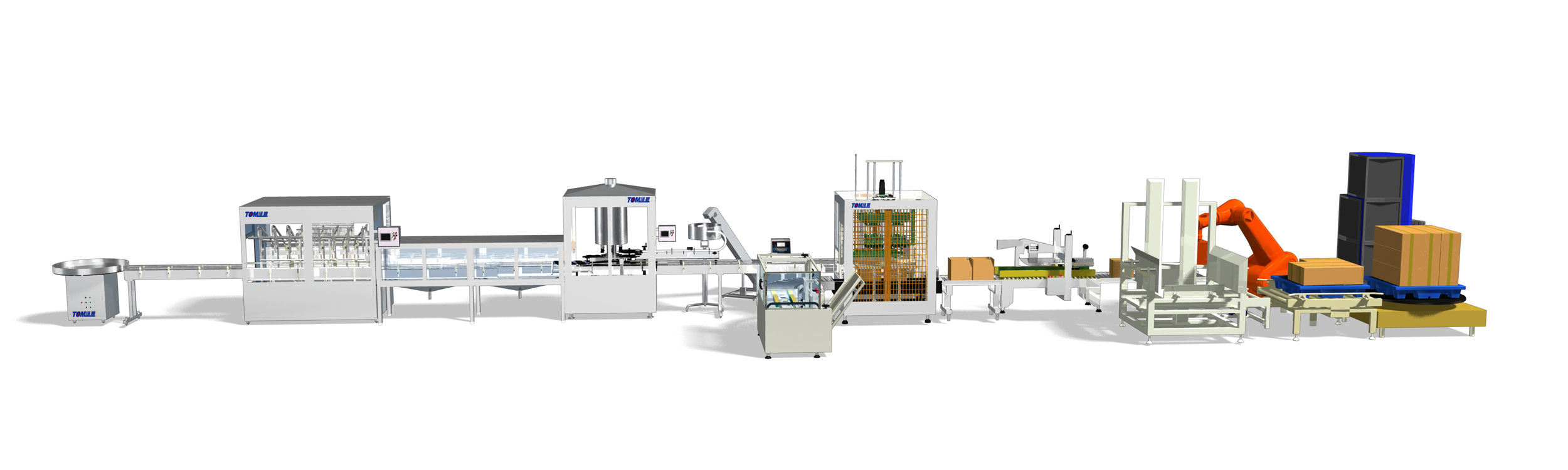 此條生產(chǎn)線(xiàn)設備配置:進(jìn)桶機、全自動(dòng)稱(chēng)重式灌裝機、全自動(dòng)封蓋機、噴碼機、開(kāi)箱機、裝箱機、封箱機、機器人碼垛機、自動(dòng)捆扎與纏繞機。